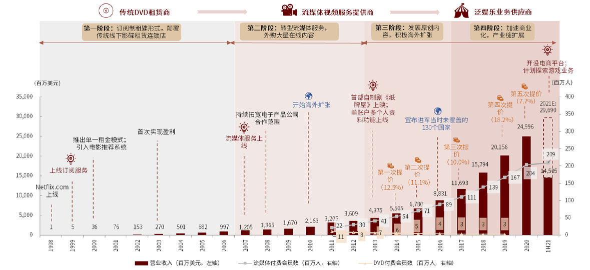 ►第一階段(1997~2006年):訂閲制顛覆傳統DVD租賃業務。公司成立早期以DVD租賃為核心業務,但打破了傳統服務商線下租賃+滯納金條款的模式,而採用「線上下單+線下郵寄+會員訂閲」的模式,通過高效便利的服務流程積累了首批付費用户。