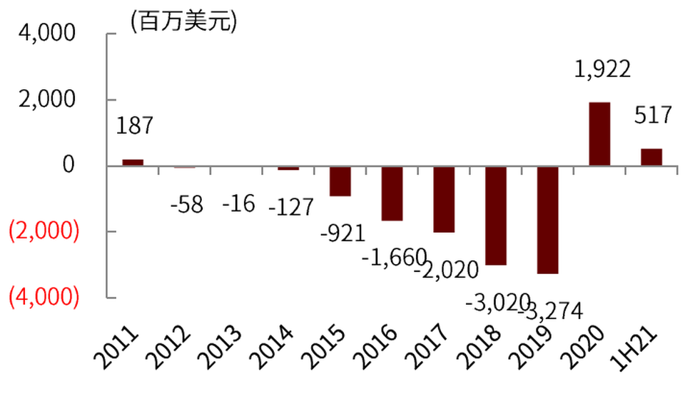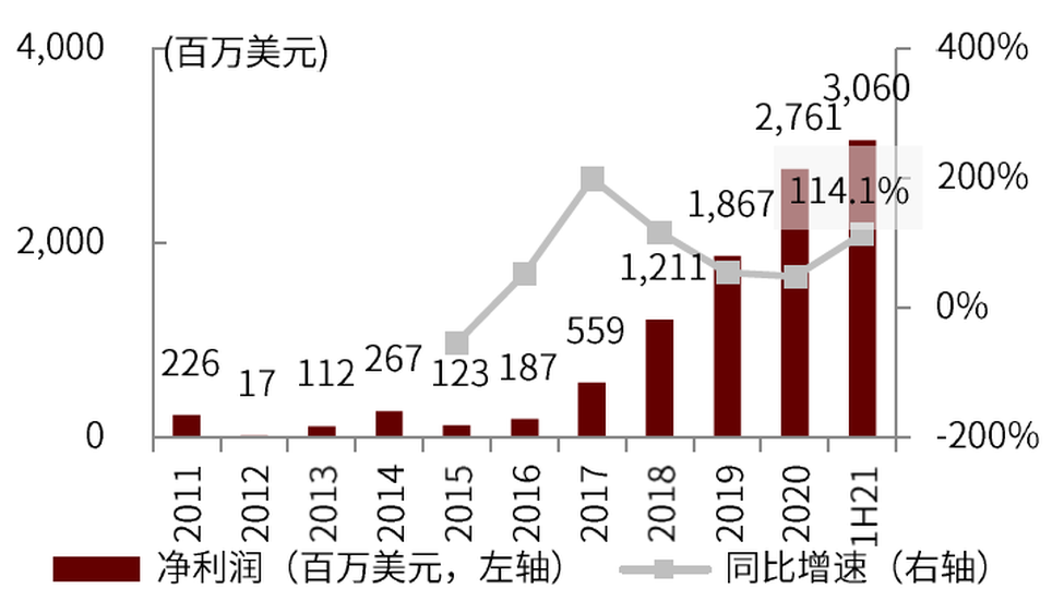 圖表:2011~1H21 Netflix淨利潤保持增長