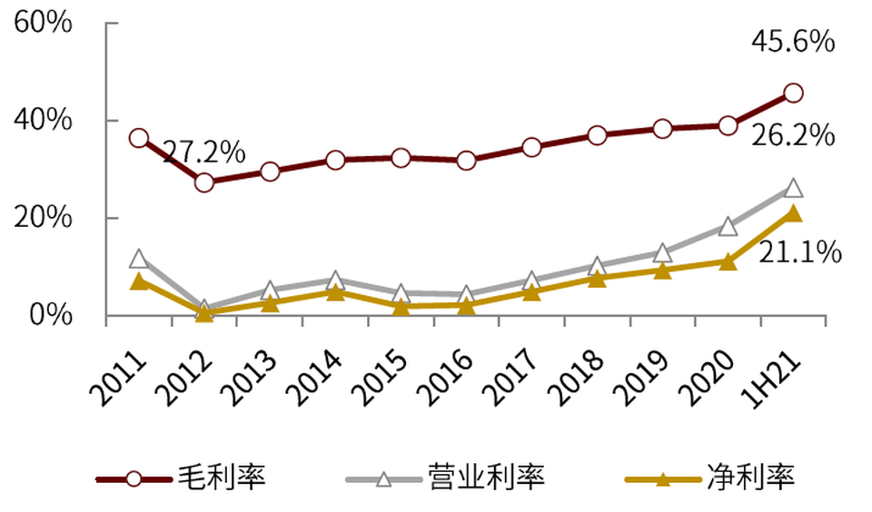 成本和費用控制有效,公司目標營業利率每年提升3ppt。公司用户數提升帶來的規模效應不斷顯現,毛利率穩步增至1H21的45.6%;雖然2018~2019年銷售費用率因原創內容推廣活動而上升,但期間費用率整體下行,1H21合計為19.4%。在有效的成本和費用控制下,1H21營業利率及淨利率分別達到26.2%和21.1%;公司在2Q21致股東信中表示預計2021年營業利率將達到20%,此後目標每年營業利率提升3ppt。