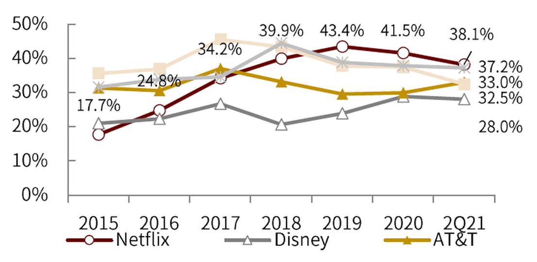 債務比例高,長期依託外部融資滿足生產投入。自2013年起開始大力投入原創內容製作,Netflix便開啟了「燒錢」模式,2013~2020年累計通過債券融資約164億美元、通過股權融資8.2億美元,填補日益擴大的現金流缺口。公司有息負債率2019年達到43.4%的高點,2Q21回落至38.1%,但仍普遍高於迪士尼等傳統媒體企業。