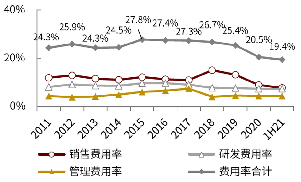圖表:2011~1H21 Netflix期間費用率穩中有降