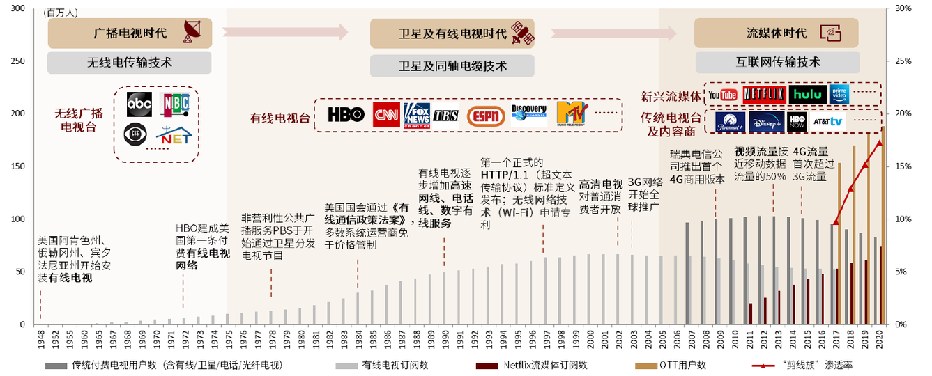 ► 技術基礎方面,流媒體技術成熟驅動媒介革命和消費者習慣轉變。20世紀末至21世紀初流媒體傳輸協議、無線網絡、4G等網絡傳輸技術的發展為流媒體行業發展奠定了基礎,流媒體也憑藉便捷性、內容豐富性和可選性等多重優勢吸引傳統電視用户向其轉移。