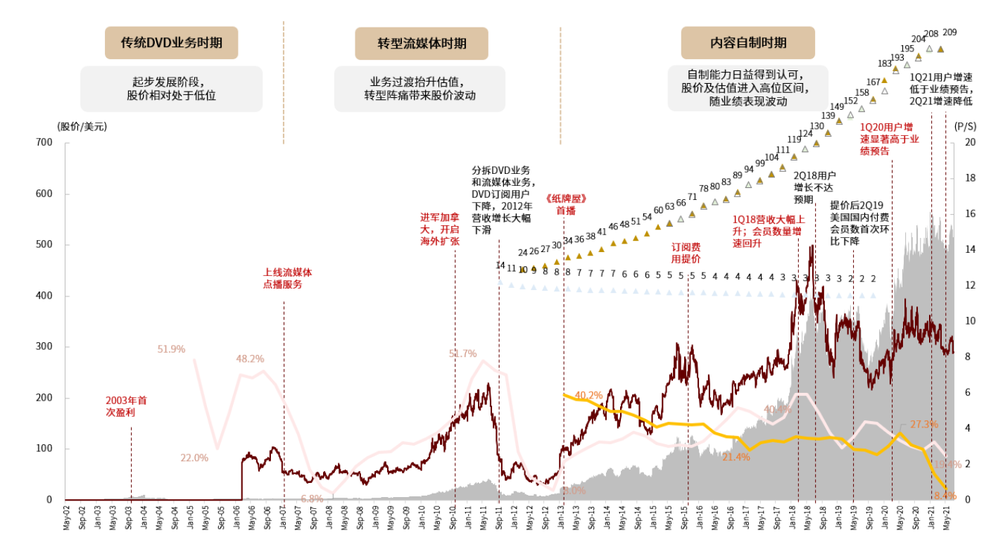 單用户市值行業領先,業務轉型和會員增長驅動股價提升。Netflix於2002年5月在美國納斯達克上市,此後數年間股價一路抬升。當前Netflix單用户市值為1,106美元,迪士尼為2,019美元;國內平台中愛奇藝單付費會員市值、快手單MAU市值、嗶哩嗶哩單MAU市值分別為82/85/141美元。根據對公司股價的覆盤,我們認為從長期看,公司先後實現從DVD業務到流媒體業務、從外購內容到自制內容的兩次轉型,抬高了P/S估值區間;從短期看,隨着公司流媒體業務深化,付費會員數增長情況作為重要業績指標在股價中得到明顯體現。