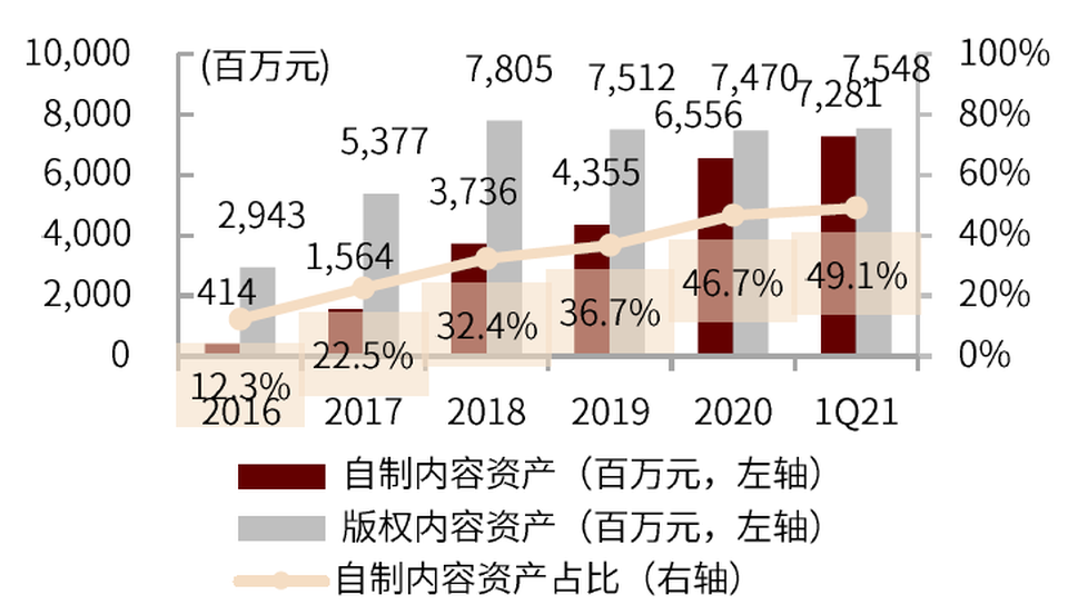 中國國內平台從外購版權逐步轉向內容自制。在中國影視行業內容成本激增、平台自制能力尚不成熟的階段,以愛奇藝為代表的中國頭部視頻平台採取和Netflix相似的「融資+燒錢」的模式,而伴隨成本壓力逐步顯現、內容競爭日益激烈,國內平台逐漸減少外購支出、聚焦自制內容。2016年以來愛奇藝自制內容資產金額不斷上升,2020年已接近版權內容資產金額。愛奇藝CEO龔宇於2021年5月接受路透社採訪時透露,目前愛奇藝頭部綜藝中自制綜藝佔比達80%以上、自制劇佔比50%左右,希望在未來1~2年將自制劇佔比提高到60%~70%。