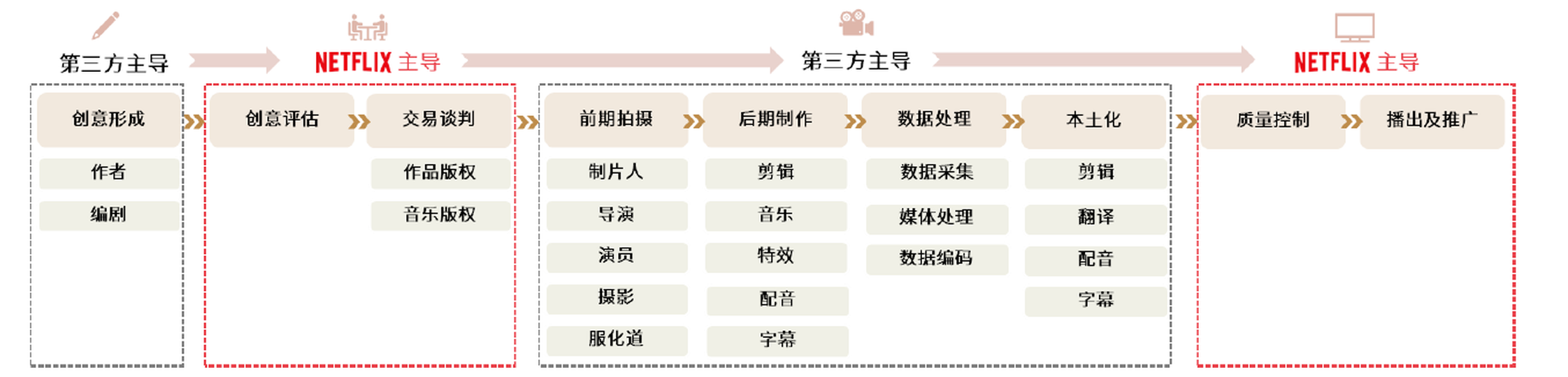 依託好萊塢工業化製作體系,獨資定製保證產出。Netflix原創劇集並非指Netflix完全參與到創作中,而更多采取獨資定製模式,即作品由第三方製作公司進行製作,Netflix進行投資發行並獲得首播權。由於好萊塢影視行業已具備高度工業化水平,編劇、導演、「服化道」(服裝、化妝、道具)等環節具有成熟的流水線,因而選擇合適的製作公司進行投資合作即可快速、高效地完成內容製作。在外部定製的同時,Netflix也逐步通過簽約和收購對上游優質人才和內容資源進行深度綁定。