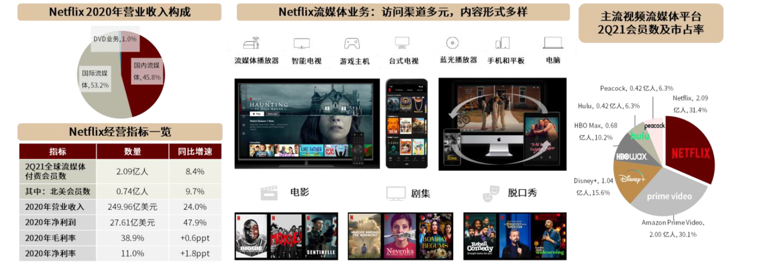 全球領先的會員訂閲制流媒體播放平台、娛樂服務提供商,擁有超2億付費會員。Netflix中文名譯作奈飛或網飛,成立於1997年,2002年5月於美國納斯達克上市,總部位於美國加州硅谷。公司早期為一家在線DVD及藍光租賃提供商,自2007年起開拓流媒體服務,業務收入從2007年的12.05億美元增長至2020年的247.57億美元,CAGR為26.2%,2020年佔營業收入比重達99.0%(公司在美國地區仍保留部分DVD租賃業務);截至2Q21在190多個國家/地區擁有2.09億付費會員,我們測算在全球六大流媒體平台中會員數市佔率約為31.4%。此外,以2013年出品首部自制劇《紙牌屋》為標誌,公司向影視內容自制不斷邁進,成為重要的網生劇集和電影生產商,形成貫穿視頻產業上下游的「流媒體+自制內容」的商業模式。