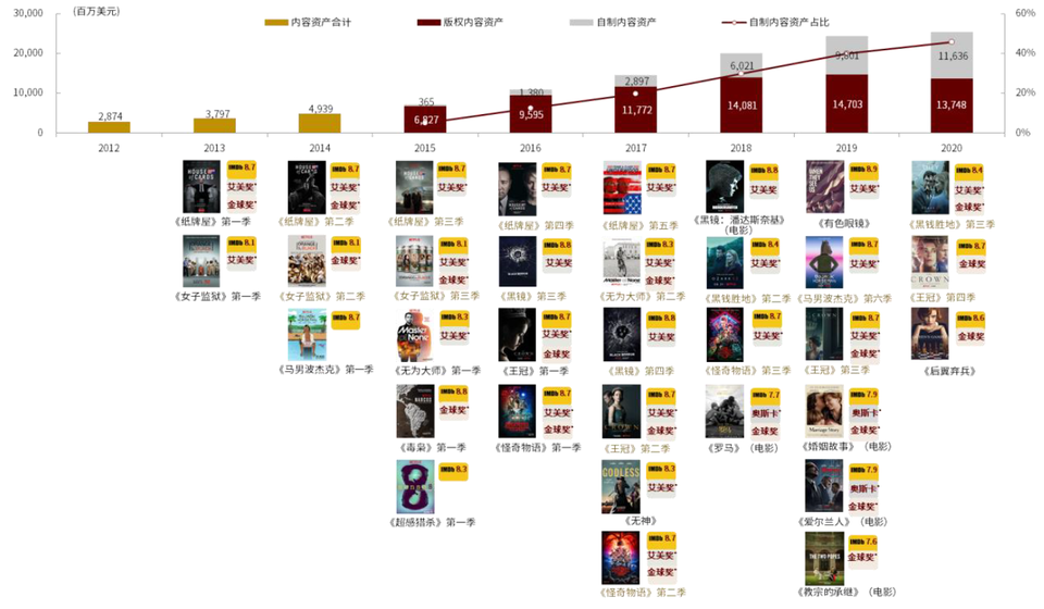 圖表:2012~2020年Netflix內容資產金額及重點自制作品