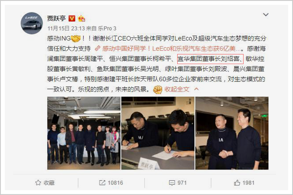 2016年11月5日,樂視出現資金危機,賈躍亭收到了來自長江商學院同學的40億元投資,他專門發微博表示感謝,其中提到的同學,就有劉紹喜。