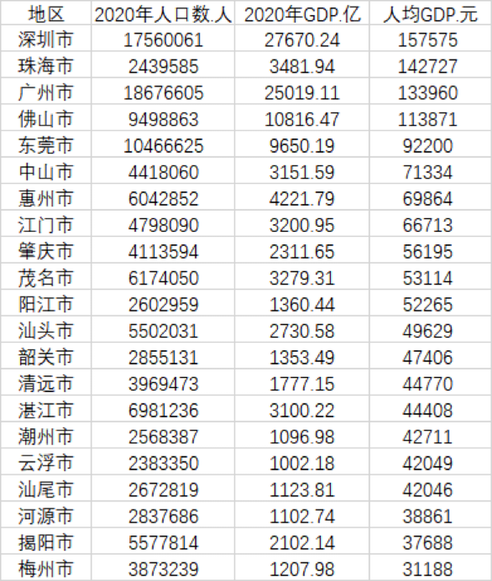 筆者根據最新的七普人口數據,梳理2020年廣東21個地市人均GDP。數據顯示,21城中,僅6個城市2020年人均GDP超過7萬元,且全部來自珠三角核心區;有10個城市人均GDP低於5萬元,全部來自粵東西北地區,有3個城市人均GDP低於4萬元,最低的梅州為31188元,僅為深圳的19.8%!