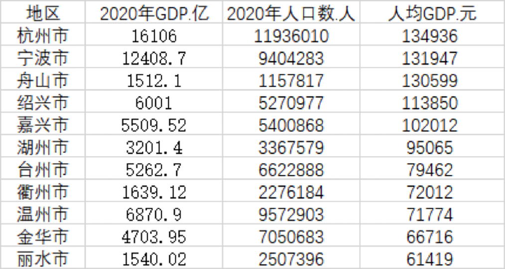 在直轄市以外的東南沿海四個經濟最發達的省份中,廣東的區域發展差距要遠大於江蘇、浙江和福建。數據顯示,浙江11個地市2020年人均GDP全部超過6萬元,其中9個地市高於7萬元。其中,最低的是浙南的山區市麗水,其人均GDP是最高的杭州的46%。