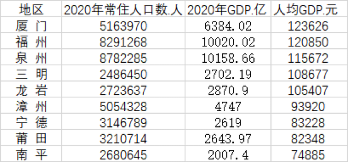 福建的9個地市人均GDP全部超過7萬元,且全部高於全國平均水平。9個地市中,有6個城市人均GDP超過了10萬元,其中最高的是副省級城市廈門,達到123626元。最低的是閩北的山區市南平,為74885元,是廈門的61%。