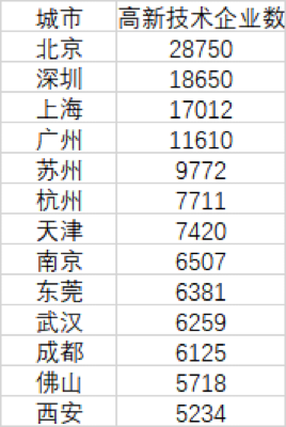 數據顯示,2020年,全國高新技術企業超過5000家的城市共有15個,這其中,珠三角地區共有4個,深圳以18650家位居第二,廣州11610家位居第四,東莞6381家位居第九,佛山5718家位居第十二。廣深兩地的高新企業數量之和超過了北京。