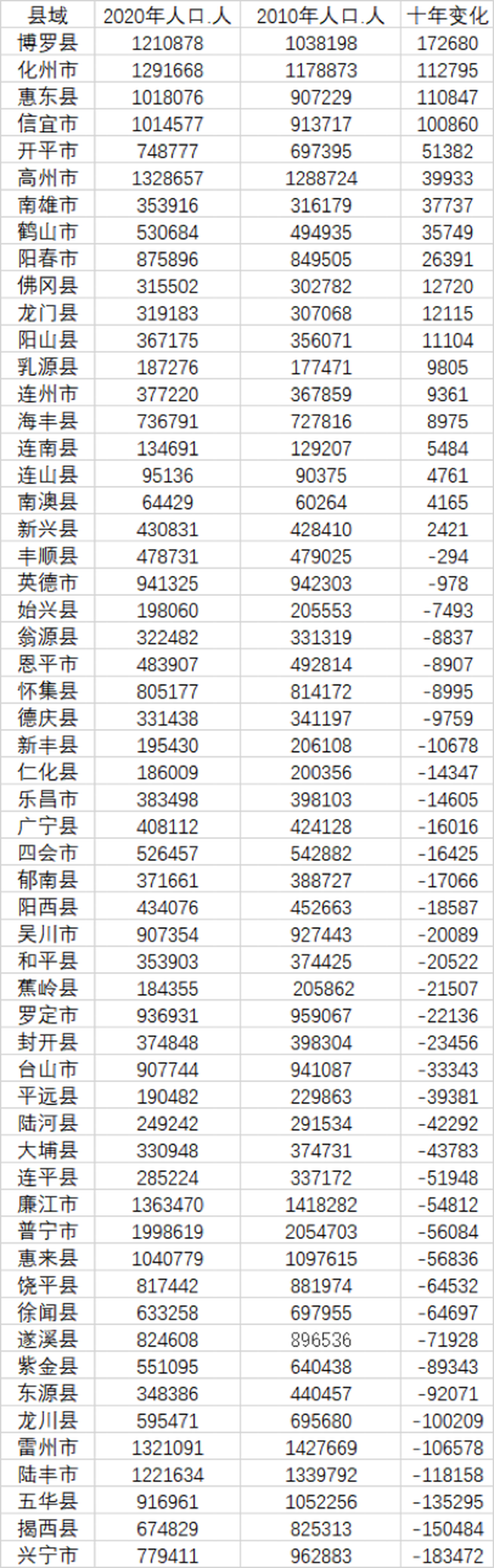 從廣東各地市十年來的人口數據變化來看,有6個市人口相比2010年出現下降,這些地市均來自粵東西北。其中,粵東北的梅州減少最多,十年來減少了36.69萬人,降幅達到了8.65%。從廣東57個縣域的人口變化來看,共有2/3的縣域十年來人口出現下降,主要位於粵東西北地區,尤其是山區的梅州、河源地區的縣域下降幅度比較大。