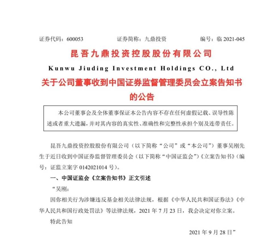 9月29日,九鼎投資晚間公告,近日收到中國證監會《立案告知書》。因吳剛相關行為涉嫌違反基金相關法律法規,7月23日,證監會決定對其立案。