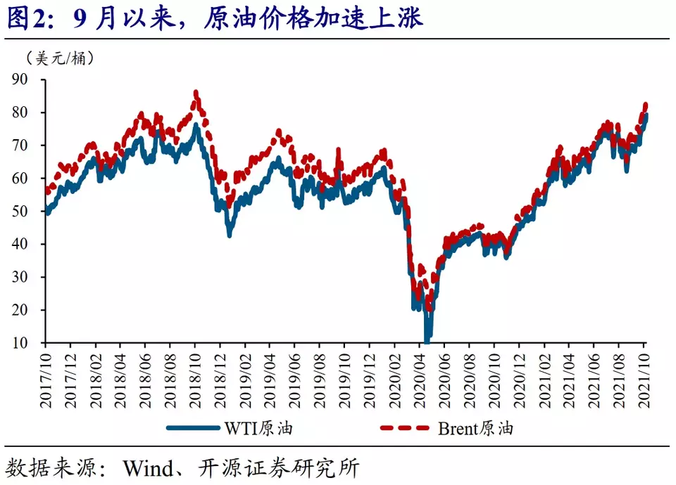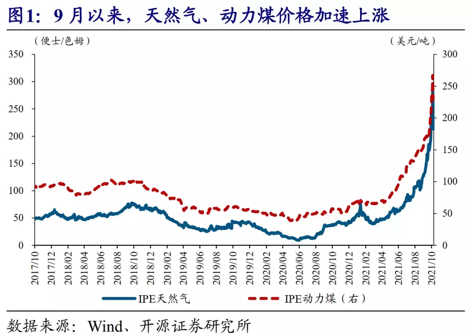 9月以來,歐美天然氣、動力煤、原油等能源品價格紛紛漲至歷史高位,能源危機持續發酵。市場數據來看,歐美天然氣、動力煤、原油等能源品價格,自9月起呈現「急速」上漲態勢。截至10月8日,IPE天然氣、動力煤價格分別漲至213便士/色姆、230美元/噸的歷史最高水平,較2020年同期的漲幅分別高達445%、299%。Brent、WTI原油價格也雙雙快速上漲至82.4、79.4美元/桶的歷史高位,分別較1年前上漲92.6%、90.1%。