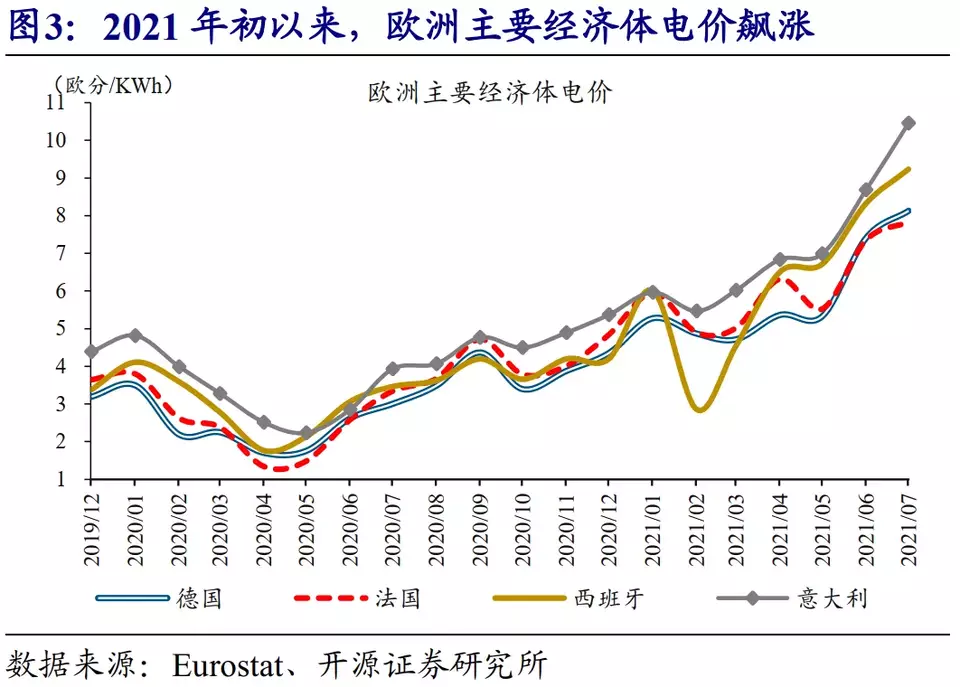 (1)截至10月8日,IPE天然氣、動力煤價格分別漲至213便士/色姆、230美元/噸,創下歷史新高。受此推動,美國及歐洲多國電力價格,紛紛刷新歷史記錄。能源及電力價格的飆漲,使美歐居民生活成本激增,部分企業更是被迫停產。