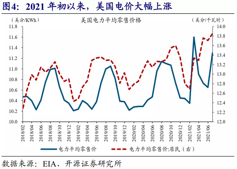 不僅如此,能源品價格的上漲,還大幅推升了歐美電力價格,進一步加劇能源危機衝擊。作為美歐發電的「燃料」,天然氣、動力煤、原油等價格的飆漲,大幅推升了美歐的發電成本。從最新電力價格來看,歐洲方面,意大利、西班牙、德國、法國電價已分別漲至10.5、9.2、8.1、7.8歐分/度,較1年前漲幅高達166%、167%、170%、134%。與歐洲相似,美國電價也大幅上漲。截至7月(最新數據),美國每度電的平均零售價格達到了11.3美分、高出過去3年同期水平,居民用電每度電價更是漲至13.9美分/度、創下歷史新高。