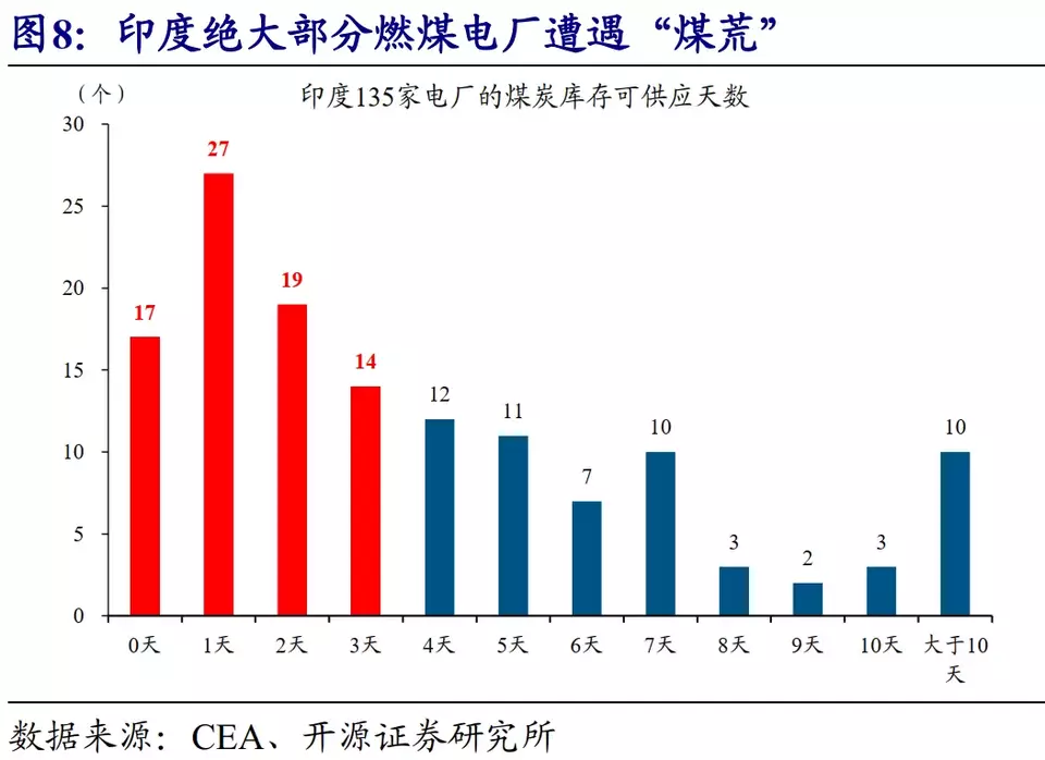 全球產業鏈高度融合下,歐美能源危機,也通過能源品價格上漲等通道,向全球加速蔓延。9月以來,巴西、印度等新興經濟體,也被捲入歐美能源危機的「漩渦」中。巴西方面,在乾旱拖累水電發電的同時,歐美帶動下的全球天然氣和動力煤價格的飆漲,使得國內火電發電成本激增。與巴西相比,水電資源不豐富、對火電依賴度更高的印度,更是深受能源品漲價之苦。由於國際市場的動力煤價格漲幅過大,印度8成燃煤電廠因無力購買而遭遇「煤荒」,剩餘煤炭庫存目前可供應天數已不足7天。
