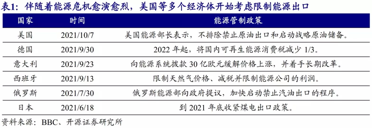 與全球過往的能源危機相比較,不難發現,本輪能源危機兼具了一次能源危機和二次能源危機的特徵。短期來看,隨着冬季到來、整體用電季節性回升,疊加傳統能源品供應難明顯擴張,本輪能源危機或將進一步發酵。中長期而言,全球碳中和的大背景下,傳統能源產能日益萎縮與綠色新能源供給波動較大、疊加儲能系統需要較長時間建立的「碰撞」下,能源危機的爆發可能較過往變得更加頻繁。