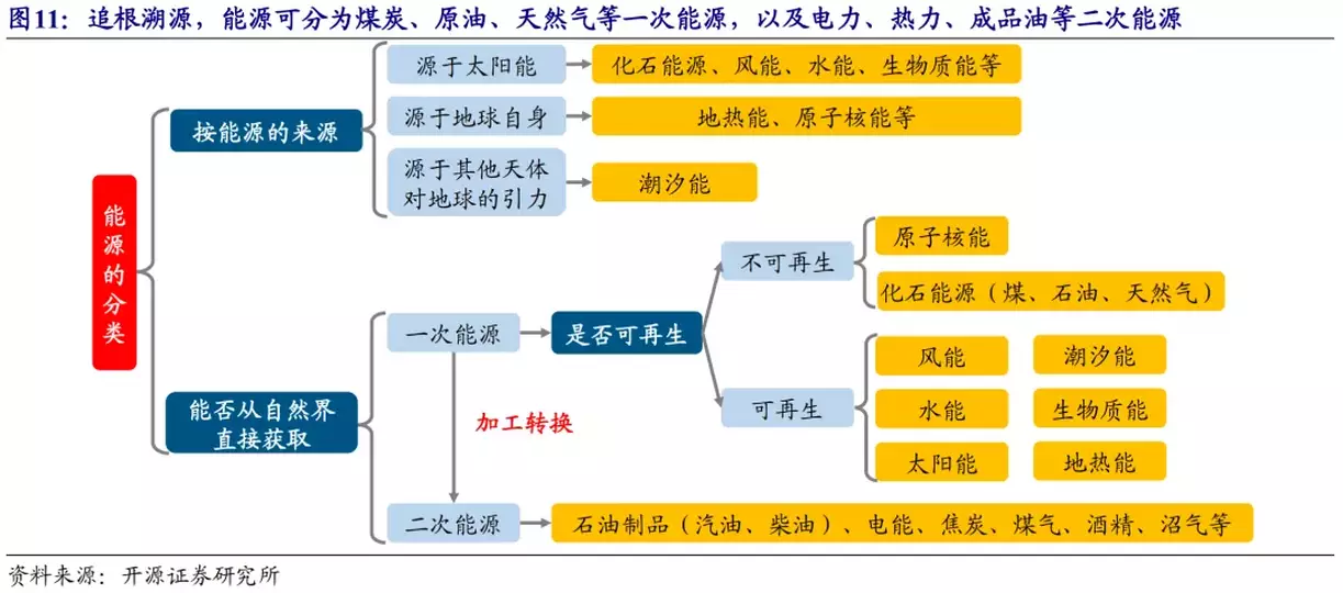 追根溯源,能源可分為煤炭、原油、天然氣等一次能源,以及電力、熱力、成品油等二次能源。在梳理過往具體爆發的能源危機之前,我們有必要首先釐清能源的相關概念。從定義來看,能源泛指可以提供能量的資源。根據能否從自然界直接獲取,能源可進一步細分為一次能源和二次能源。其中,一次能源主要包括了煤炭、石油、天然氣等不可再生能源,以及風能、水能、太陽能等可再生能源。作為一次能源加工後的「產物」,二次能源主要為電力、熱力、成品油等。