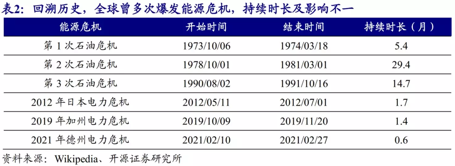回溯歷史,全球曾多次爆發能源危機,持續時長及影響不一。分別爆發於1973年、1979年、1990年的3次石油危機,是市場相對熟知的能源危機。這3次石油危機,持續時長在5個月到30個月不等。由於危機持續時間較長,美國等主要經濟體的工業生產、居民生活均受到明顯衝擊,美國更是一度陷入滯脹。除了3次石油危機外,過往爆發的能源危機還有2012年日本電力危機、2019年美國加州電力危機,以及2021年美國德州電力危機。與石油危機相比,這3次電力危機持續時長較短,影響範圍相對有限。