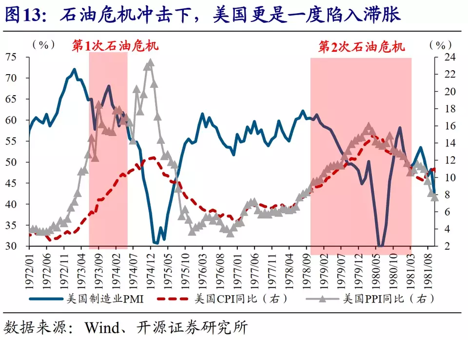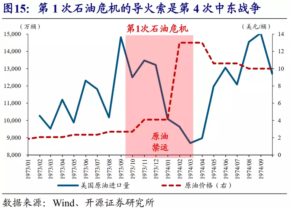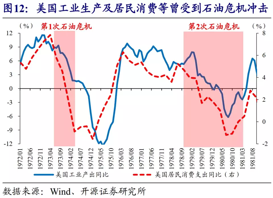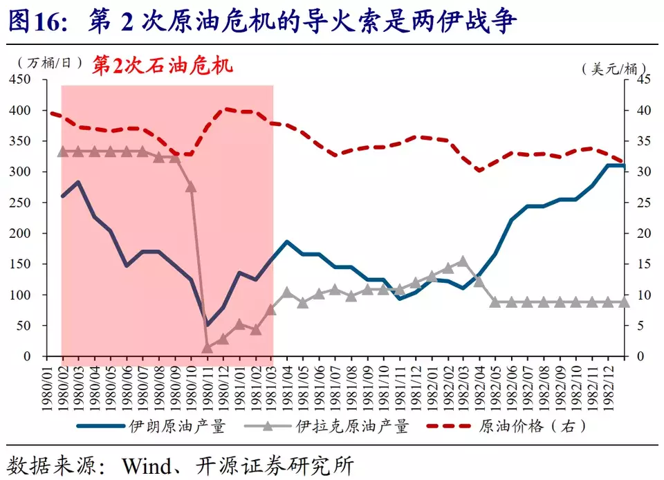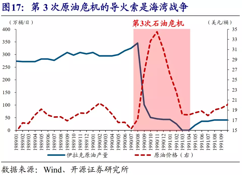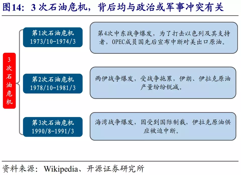 歷史上爆發的3次石油危機,都是一次能源危機,背後均與政治或軍事衝突有關。第1次石油危機的導火索是1973年第4次中東戰爭的爆發,為了打擊以色列及其支持者,OPEC多個成員國先後宣佈中斷對美國的原油出口。受此影響,油價由3美元/桶大漲至10美元/桶以上。與第1次石油危機相似,第2次、第3次石油危機爆發背後分別是兩伊戰爭、海灣戰爭。由於戰爭拖累了原油的生產、供應,全球油價隨之大幅上漲。