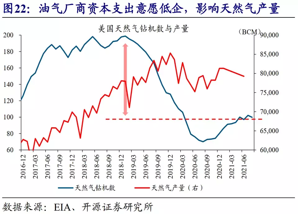 本輪能源危機爆發的根源,在於疫情衝擊及採礦類企業資本開支意願低企下,傳統能源品的產能彈性大幅下滑。2020年疫情爆發以後,天然氣、原油等傳統能源開採行業出現企業破產潮,產能一度跌至冰點。雖然隨後疫情減輕、需求端逐步回暖,但對改善自身現金流的極度渴望,以及全球主要經濟體紛紛加快推進「碳中和」政策,使得這些傳統能源開採企業的資本開支持續低企。受此影響,無論是天然氣、原油,還是動力煤等,產能彈性都大幅下滑,供需缺口持續拉大。