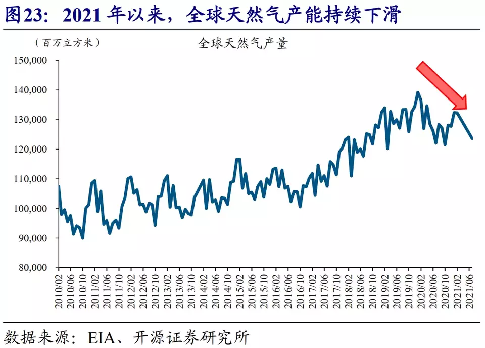 (5)本輪能源危機爆發的根源是傳統能源品的產能彈性大幅下滑,導火索由拉尼娜等極端天氣觸發。2020年以來,疫情拖累部分產能出清,以及全球碳減排政策加速推進持續抑制企業資本開支意願,使天然氣等傳統能源行業的產能彈性大幅下滑。伴隨着極端天氣嚴重拖累綠色能源發電、引發對傳統能源的發電需求激增,天然氣、動力煤等供需缺口大幅走擴,價格飆漲。而這,又最終觸發了電力危機。