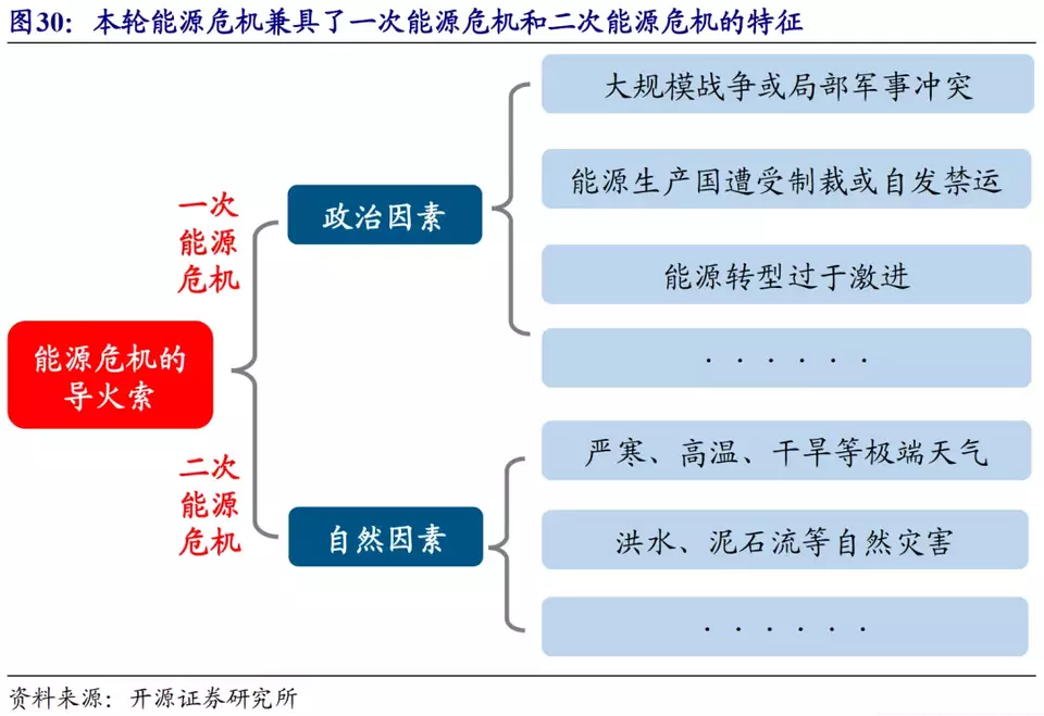 (4)總結規律來看,全球一次能源危機往往與政治或軍事衝突有關,二次能源危機則更多是由極端天氣或自然災害等引發。比如,3次石油危機的導火索,均是軍事衝突,即中東、兩伊及海灣戰爭。與之不同,2012年日本電力危機背後是海嘯引發福島核電站泄露,2019年美國加州電力危機緣於野外大火導致電力系統癱瘓。