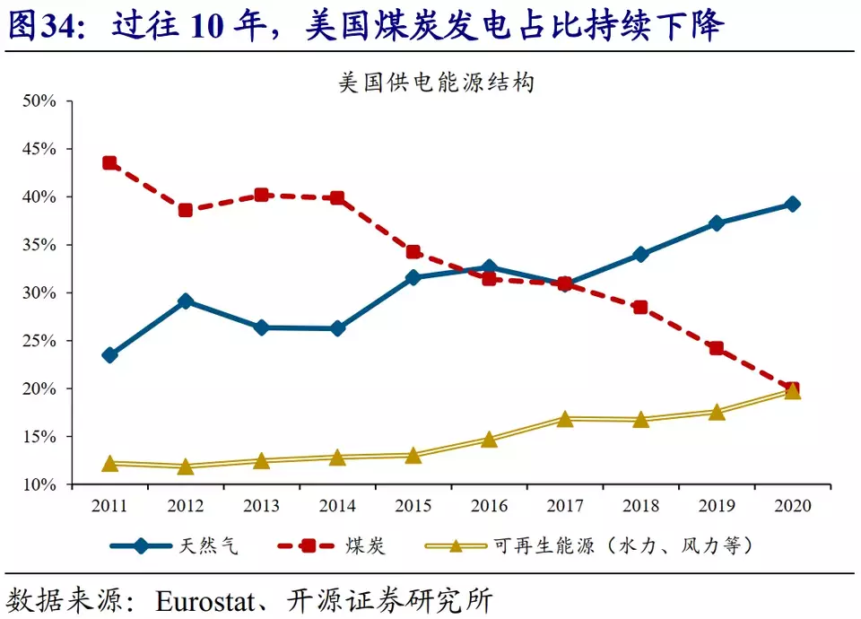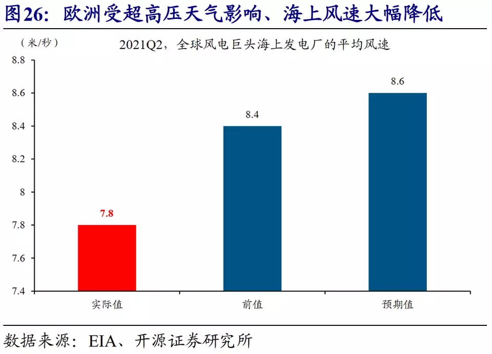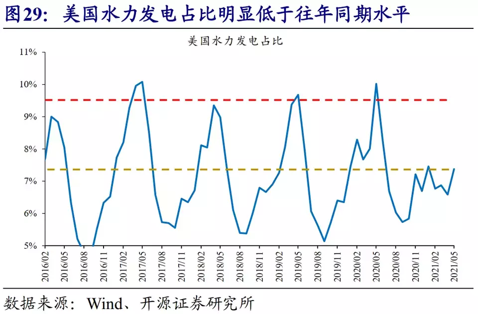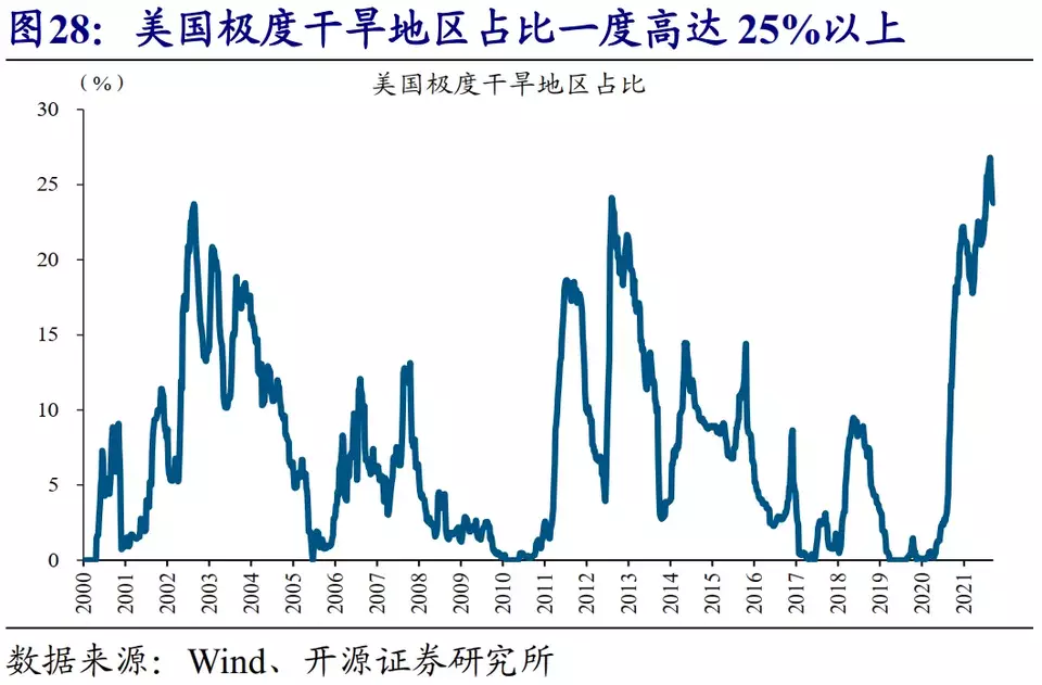 本輪能源危機爆發的導火索,是極端天氣嚴重拖累綠色能源發電,導致對傳統能源品的發電需求激增,後者供需缺口隨之急劇走擴。歐洲方面,年初以來,因為長時間出現超高壓天氣,海上風速大幅下降,風力發電量隨之驟降。與歐洲一樣,美國也遭遇了極端氣候干擾。年初至今,因拉尼娜現象持續發酵,美國遭遇了百年未遇的乾旱天氣,極度乾旱地區佔比一度高達25%以上。受此拖累,美國水力發電大幅下滑。風電、水電的缺位,使得美歐對火電的替代需求激增。需求大幅增長、疊加供給彈性嚴重受限,最終推動天然氣、動力煤及油價大漲,並反過來傳導到電力價格端。