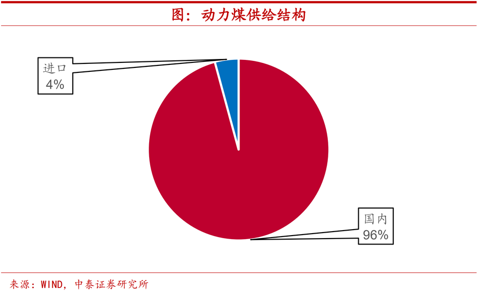 進口佔比微弱,供給多靠國內。雖然煤炭進口限制對於供應收縮存在一定的影響,但其實從供給結構上來看,中國動力煤供應超過96%均來自國內,進口部分的佔比只有4%左右。因此,即便進口下滑兩至三成,對於煤炭供給的影響大約也就在1個百分點,並不會主導煤炭供給的趨勢。今年以來的供應偏緊還是和國內產出增長相對遲緩有關。