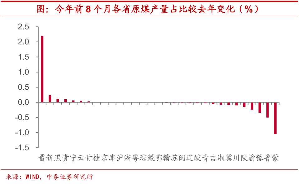 內蒙產出佔比下滑,拖累煤炭整體供應。從地區煤炭產量上來看,今年煤炭供給的拖累主要是來自內蒙古。整體而言,中國煤炭供應的集中度較高,內蒙古和山西作為煤炭的生產大省,兩者的原煤產量能佔到全國一半左右,而加上陝西的話,三者原煤合計產出接近全國的七成。但今年前8個月,內蒙古原煤產量佔比較去年底下滑超過1個百分點,在全國各省市中排名墊底,這無疑加劇了煤炭供應的緊張程度。