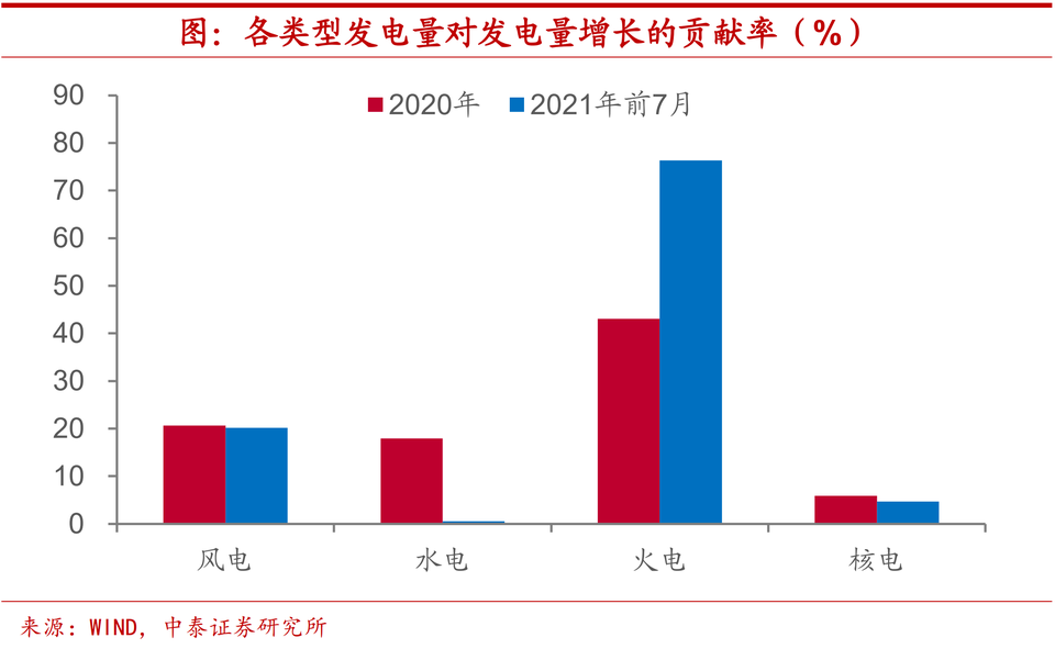 火電依賴上升,水電錶現不佳。不過,從發電結構上來看,今年水電錶現明顯不及去年,而對於火電的依賴顯著上升。2020年全年水電對於發電量增長的貢獻率接近18%,而今年前7個月幾乎歸零,與之形成鮮明對比的是,火電對於發電量增長的貢獻率由去年的43%一舉提升至超過75%。