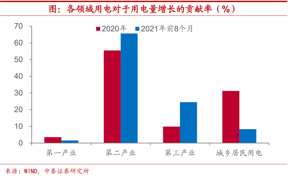 到底誰是今年用電大户?三季度以來,中國多個省市出現了「拉閘限電」的現象,特別是部分地區甚至居民用電也受到了影響,而今年全國主要電網最高用電負荷明顯高於過去五年同期平均水平。不過,一方面,從電力供應上來看,發電設備似乎並未開足馬力。而另一方面,從電力需求情況上來看,經濟增長和發電量之間的關係依然穩定,並未出現較大程度變化,用電增長也並未對發電系統提出超出以往水平的過高要求。發電量的高增速和經濟增長狀況類似,都是受到去年同期低基數的影響。從發電結構上來看,今年水電錶現明顯不及去年,而對於火電的依賴顯著上升。今年前7個月火電對於發電量增長的貢獻率由去年的43%一舉提升至超過75%。從用電端來看,今年以來第二產業對於用電量的增長貢獻最為突出,但相比於去年,第三產業的改善幅度更大。從製造業行業來看,其實今年高耗能行業的用電量增長相對而言並不算快,在政策嚴控下得到了一定程度的約束。