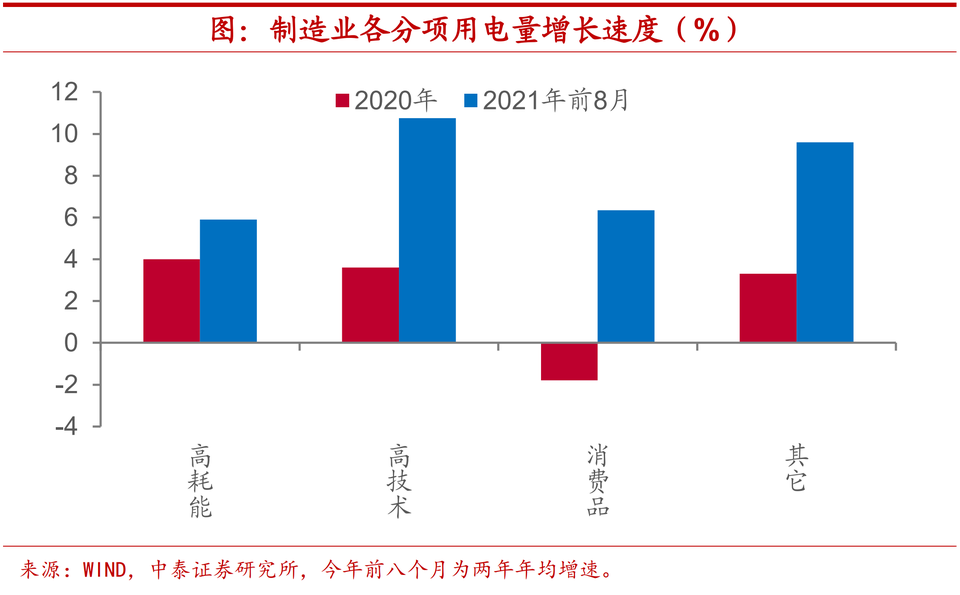 高技術行業增速領跑,高耗能用電存在約束。從製造業中各類行業的表現上來看,其實今年高耗能行業的用電量增長相對而言並不算快,在政策嚴控下得到了一定程度的約束,今年前八個月高耗能製造業用電量兩年年均增速不足6%,較去年提高不足2個百分點,而高技術製造業用電量兩年年均增速超過10%,消費品製造業的兩年年均增速也要超過高耗能行業。