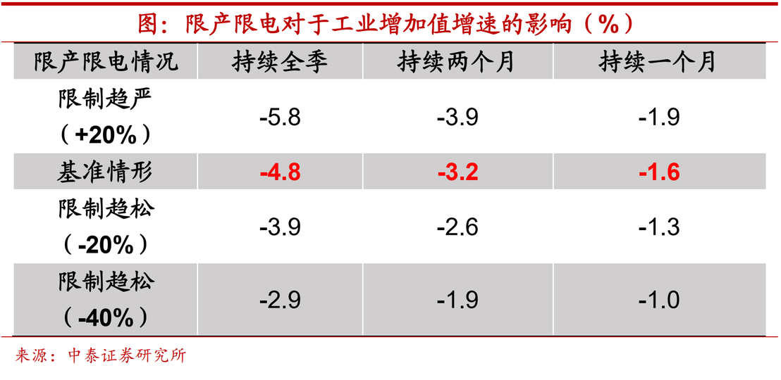 我們綜合考量了行業數量和電力消費情況,對行業進行如下分組:將消費量在850億千瓦時以上的歸為高能耗組,限產限電政策影響最為顯著,假設和鋼鐵行業的程度相當;將消費量在200億千瓦時以下的歸為低能耗組,假設限產限電政策影響微弱;將消費量在200億千瓦時至850億千瓦時之間的歸為中能耗組,假設限產限電政策影響適中,約為高能耗組的一半。