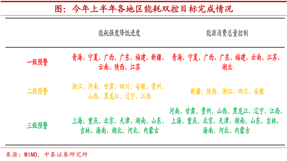 達成能耗雙控,限電無奈之舉。從直觀感受上來說,「拉閘限電」和完成全年「能耗雙控」目標之間存在着較為直接的聯繫。根據二季度發改委發布的各地區能耗目標完成情況,還有八九個省份處在一級預警區間,能耗強度降低進度和能源消費總量並未達到預期的控制效果,因此,為了目標完成而主動限電就成為不少地市的無奈之舉。
