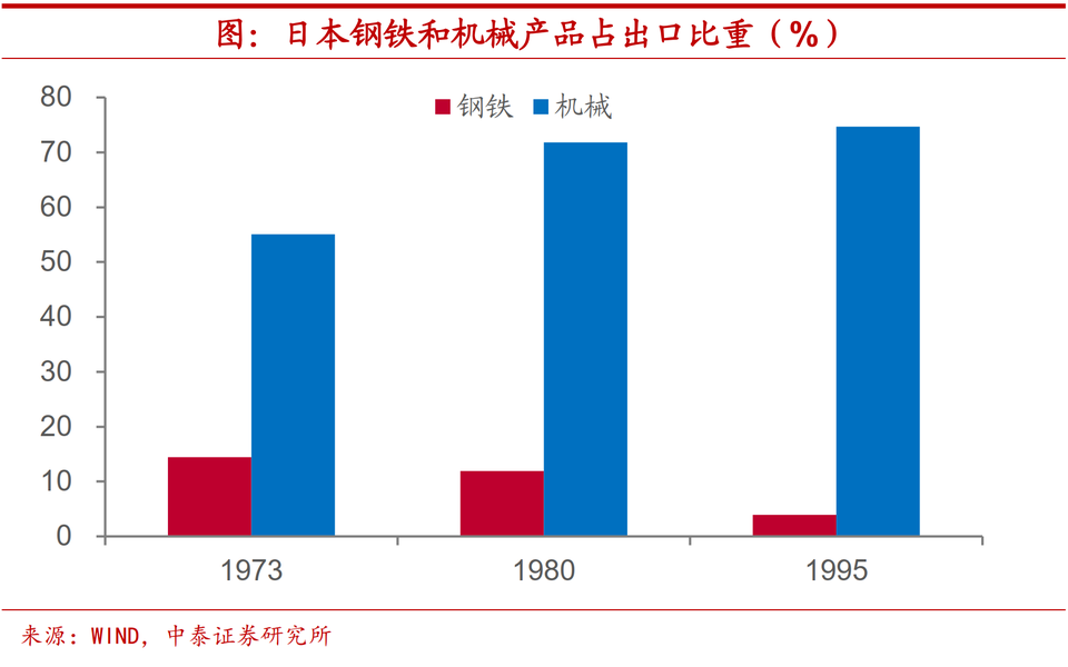 日本的轉型經驗就充分表明了能源價格提升對於產業結構的影響。在遭遇石油危機帶來的成本衝擊之後,日本着力擺脱過去對於能源和燃料等資源的過度依賴,推行「技術立國」,特別是通過電子技術革命推動日本產業結構邁向高級化,發展知識和技術密集型行業。從日本出口結構上來看,這一時期鋼鐵等重工業品佔比不斷下降,機械等資本品出口比重顯著上升。