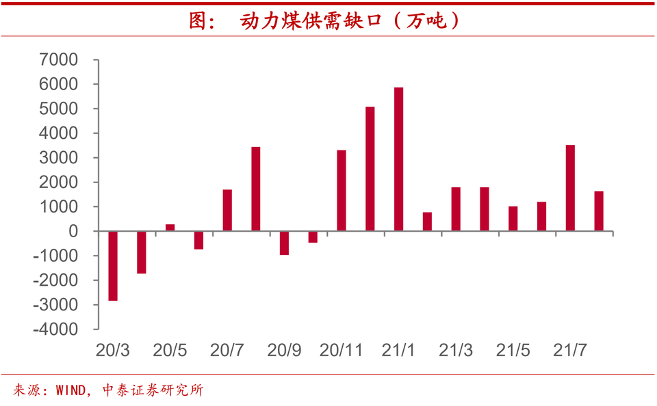 供需偏緊,缺口較高。結合前文分析,今年發電對於火電的依賴度明顯上升,因此,我們認為,「電荒」的根源還是出在煤炭供應上。根據我們的估算,今年以來煤炭供需就相對偏緊,並未出現往年在個別月份能夠看到的供給超出需求的現象。3月以來動力煤的供需缺口一直維持在1000萬噸以上。