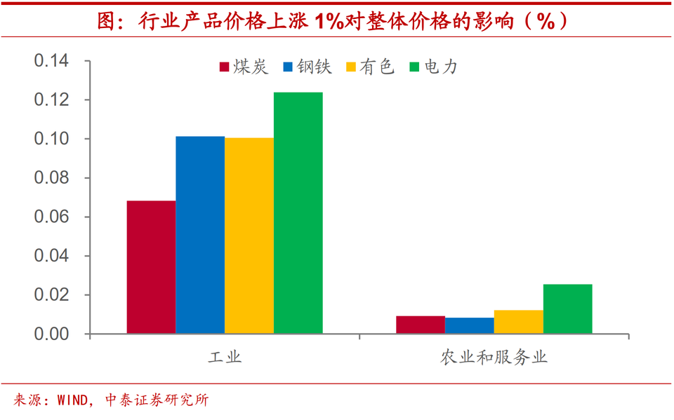 電價調整物價上漲,或將加速價格傳導。另外,不容忽視的是,緩解「電荒」問題所採取的電價調整措施,也會帶來國內物價水平的波動。根據投入產出表的測算,同樣幅度的價格上漲,電力對於整體物價水平的影響程度要高於煤炭、鋼鐵和有色等行業,並且,電力價格波動對於CPI增速的影響比這些上游原材料製造類行業價格變化更為顯著,可能會加快價格上漲由PPI向CPI的傳導。測算結果表明,如果按照調價措施電價上漲10%,將會帶動PPI增速上行1.2個百分點左右,而對CPI增速的影響約在0.2-0.3個百分點。