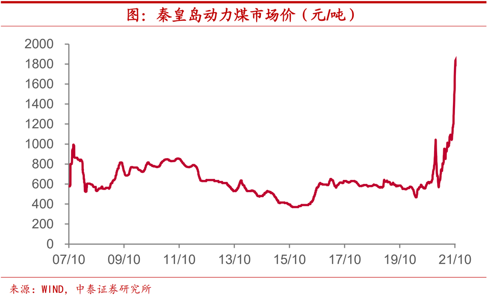 價格飆升,前所未見。在供需格局緊張的作用下,煤炭價格今年以來也是持續攀升。截止今年9月底,秦皇島動力煤市場價較去年底上漲幅度已超過113%,價格絕對水平也已突破1500元/噸,而從2007年至2020年這十幾年間,動力煤的最高價格也就在1000元/噸左右。