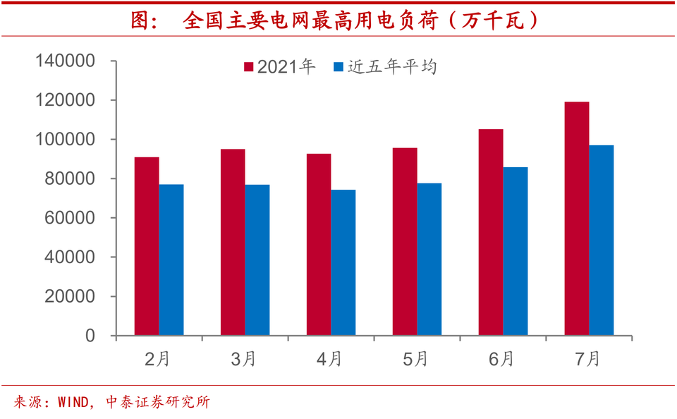 電荒多省蔓延,負荷遠超同期。三季度以來,中國多個省市出現了「拉閘限電」的現象,特別是部分地區甚至居民用電也受到了影響,如9月29日遼寧省發布嚴重缺電II級橙色預警信號,決定全省啟動有序用電II級措施。從全國主要電網最高用電負荷來看,今年以來明顯高於過去五年同期平均水平,7月最高用電負荷接近12億千瓦,而過去五年同期平均只有不到10億千瓦。