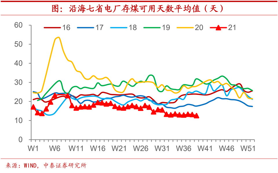 庫存創下新低,去年同期減半。偏緊的供給和高企的價格,導致電廠煤炭庫存嚴重不足。今年9月以來,沿海七省電廠存煤可用天數只有13天左右,創下2016年以來的同期新低,與之相對應的是,2019年和2020年同期存煤可用天數水平要超過25天,大約是今年的2倍左右。