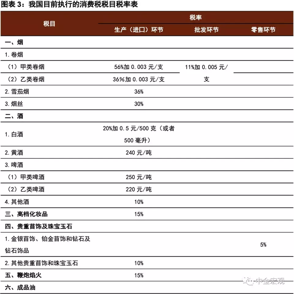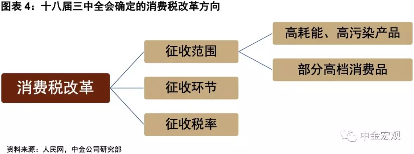 消費稅改革的框架早已確定,具體從徵收範圍、稅率、環節三個方面展開。消費稅自1994年開徵以來,經歷三輪制度調整,前兩輪分別是2006年消費稅制度改革,將徵稅範圍從原有的11類消費品擴大到14類消費品;2008年開始的成品油稅費改革,提高成品油消費稅稅率。2013年十八屆三中全會《中共中央關於全面深化改革若干重大問題的決定》中提出,「調整消費稅徵收範圍、環節、稅率,把高耗能、高污染產品及部分高檔消費品納入徵收範圍」,確立了2014年以來新一輪消費稅改革的方向(圖表4)。