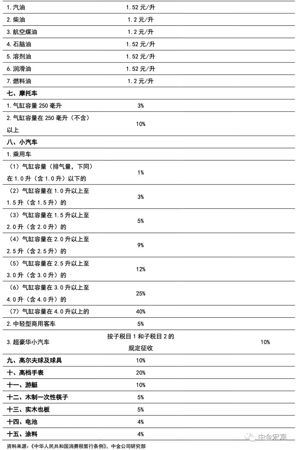 徵收稅率看,一方面對高污染和奢侈消費加徵消費稅,如成品油消費稅稅率三次上調,煙草消費稅稅率大幅提高,對超豪華小汽車加徵10%消費稅,將電池、塗料列入徵稅範圍,2021年6月對合芳烴、輕循環油和稀釋瀝青等部分成品油視同石腦油或燃料油徵收進口環節消費稅。另一方面,對部分已變得相對日常的消費品降低消費稅。取消小排量摩托車、汽車輪胎、車用含鉛汽油、酒精消費稅,對普通美容、修飾類化妝品免徵消費稅,高檔化妝品消費稅稅率由30%下調為15%。
