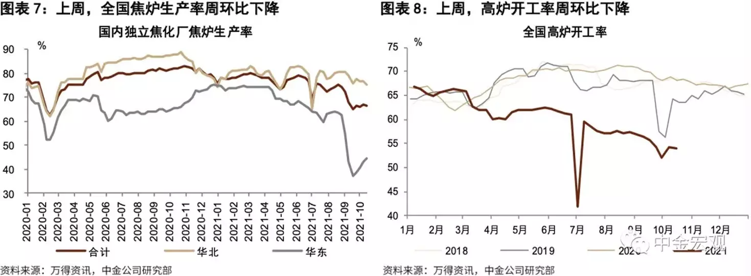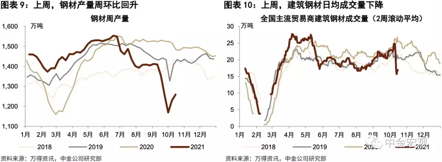 雙控影響邊際減弱,上游生產有所恢復。能耗雙控政策影響主要集中在9月,國慶節後各地政策邊際放鬆,高爐開工率、鋼材周產量等均較9月底的低點有所修復,其中高爐開工率較9月底提高1.9個百分點至54%,鋼材周產量較9月底提高7.7%到1259萬噸。但限產限電等影響仍在持續,年內上游生產或持續受到壓制,難以恢復到年中水平。需求端來看,國慶節後建築鋼材成交量回落,商品房成交面積、汽車銷售量等均按年下降,內需總體仍然偏弱。