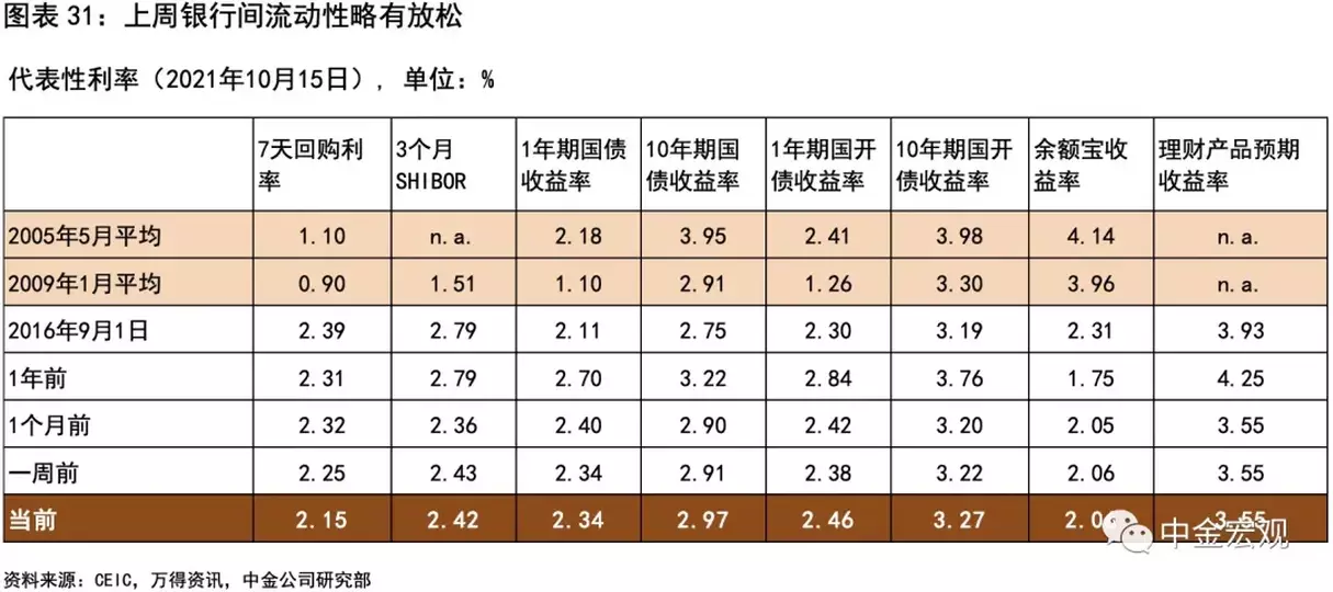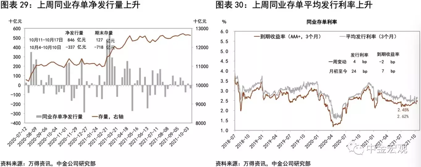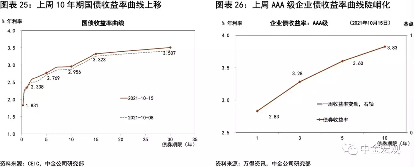 短端流動性有所放鬆,國債收益率曲線陡峭化。上周R007從2.25%下降10bp至2.15%,比央行7天逆回購利率2.20%略低。3個月SHIBOR下降1個bp至2.42%。1年期國債收益率上升8bp至2.46%,10年期國債收益率從2.91%上升至2.97%。