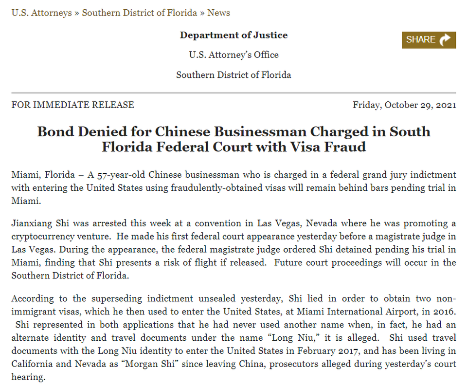 然而,美國司法部的聲明或許讓施建祥的「夢想」折翼,在這份聲明中,美國司法部表示:「施建祥在拉斯維加斯的一個會議上被捕,當時他正在推廣一個加密貨幣企業。」