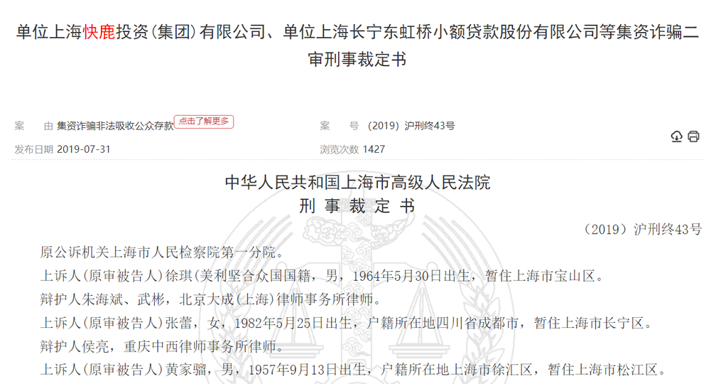 2019年7月,上海市第一中級人民法院公開了「快鹿系」集資詐騙非法吸收公眾存款案二審刑事裁定書。刑事裁定書顯示,2013年9月至2015年8月間,施建祥為實施非法集資活動,組建了個人實際控制的快鹿集團。2014年3月至2016年4月,快鹿集團通過實際控制的被告單位東虹橋小貸公司、東虹橋擔保公司和金鹿系、當天系、中海投系等融資平台,非法集資共計人民幣434億餘元。
