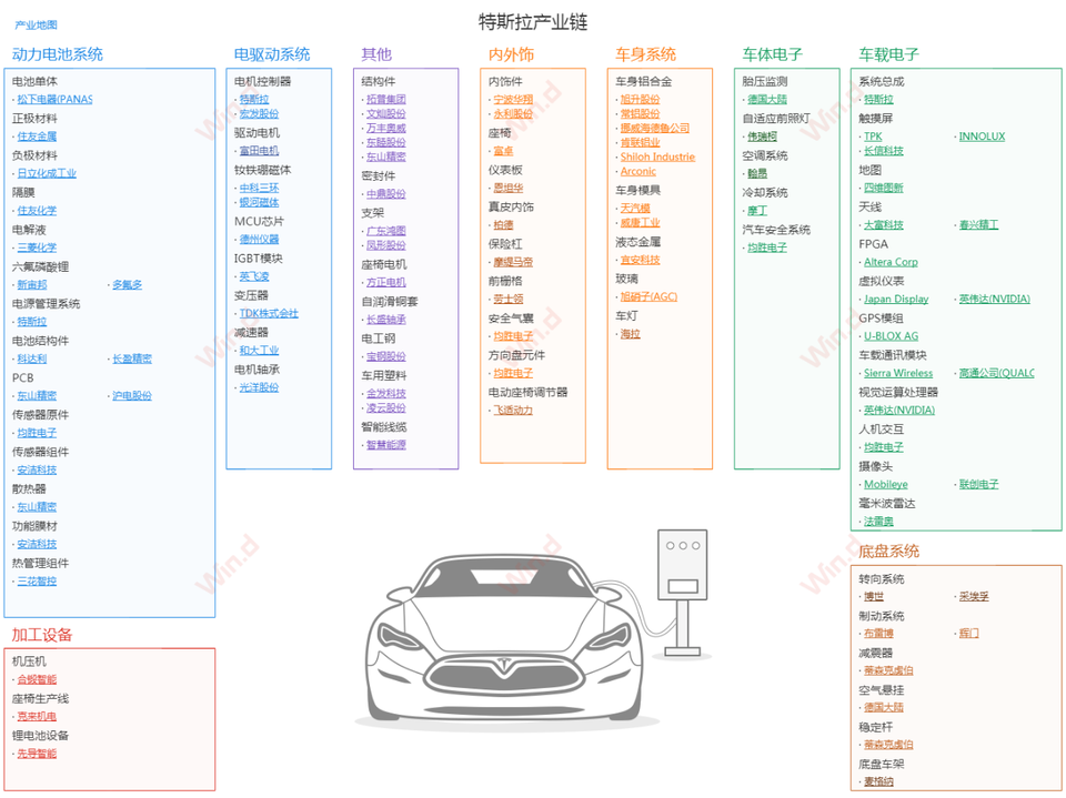 據Wind數據,Tesla產業鏈圖譜如下: